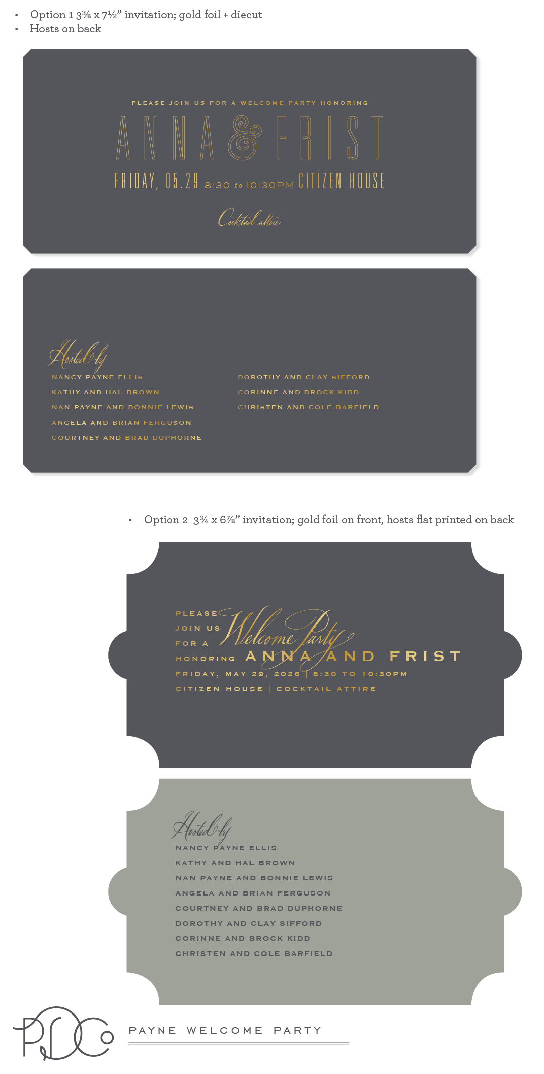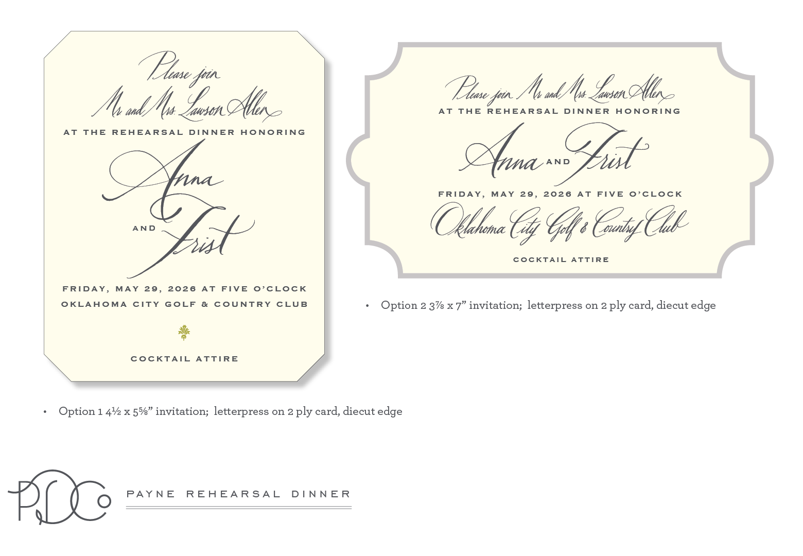 Back to Dashboard Round 3 Rehearsal Dinner Welcome Party ROund 2 2 thoughts on “Payne invitations” We love the first option! Do you have an example of what that brass tag looks like? I love it! We also love the first mailer. Log in to Reply What would the RSVP card look like? Log in to Reply Leave a Reply Cancel replyYou must be logged in to post a comment.